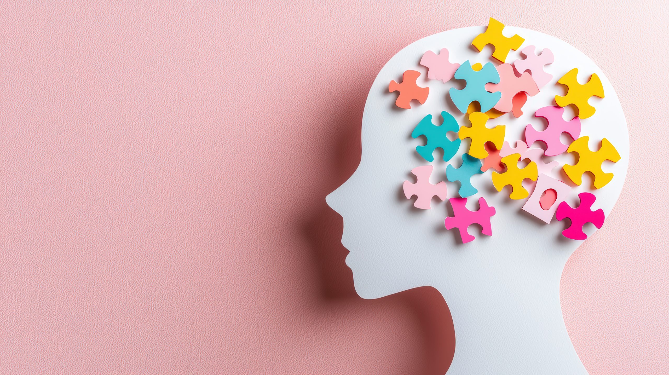creative representation of white paper cutout head silhouette filled with colorful puzzle pieces, symbolizing complexity of thoughts and emotions.