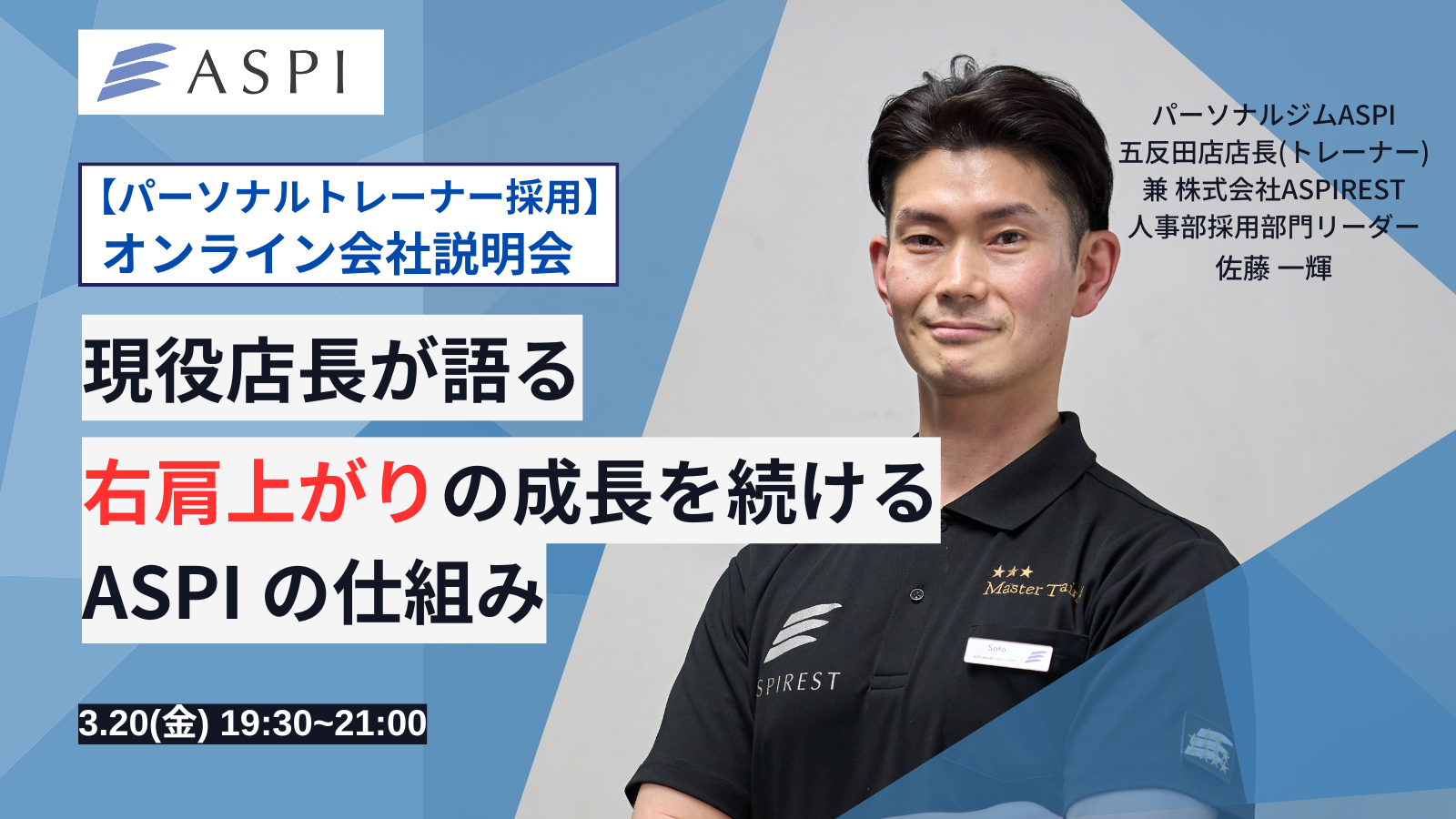 ①:パーソナルジムASPI 五反田店店長 兼 Grandトレーナー 佐藤一輝